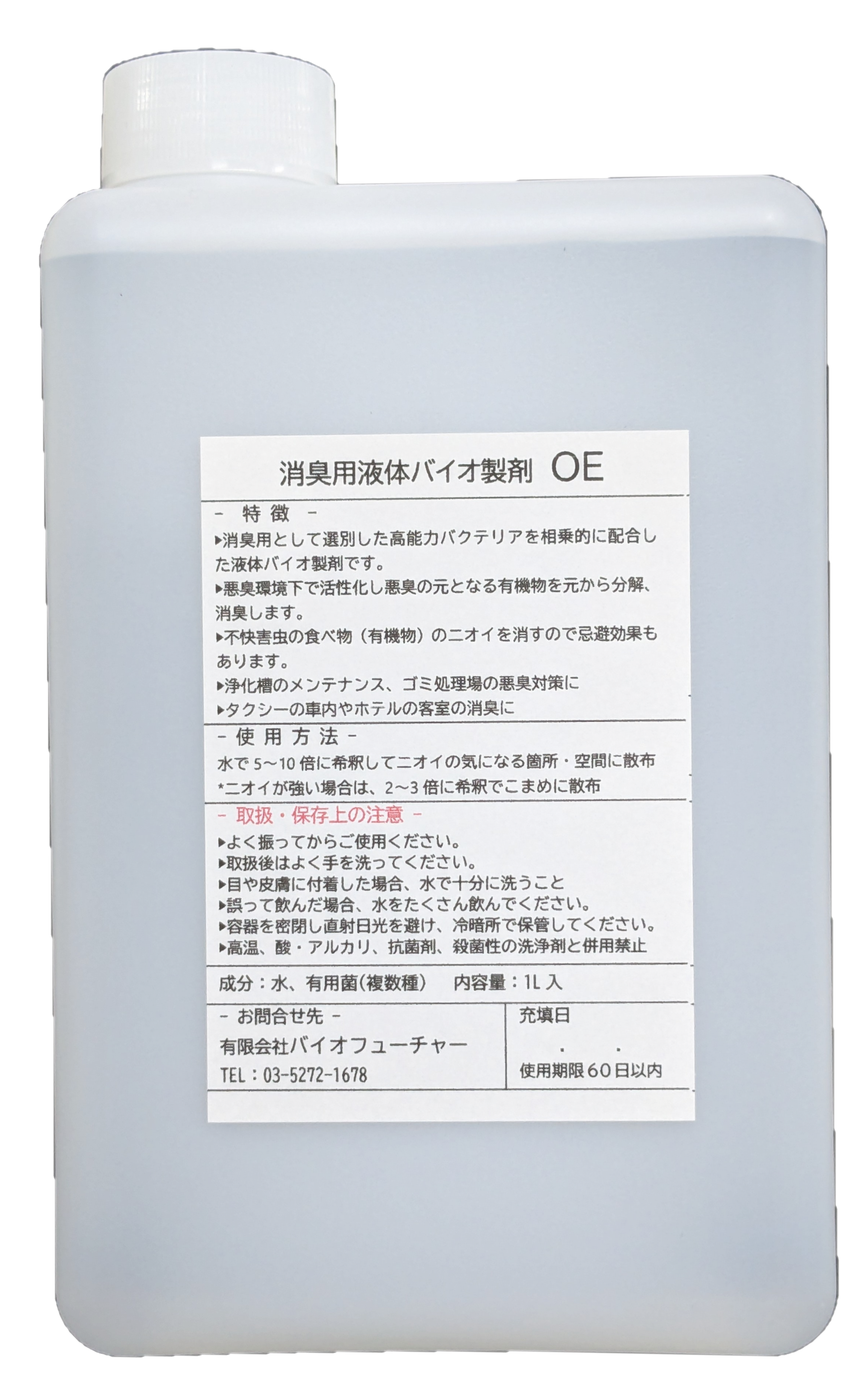 OEは、消臭専用として厳選した複数の高機能バクテリアを配合した液体バイオ製剤です。