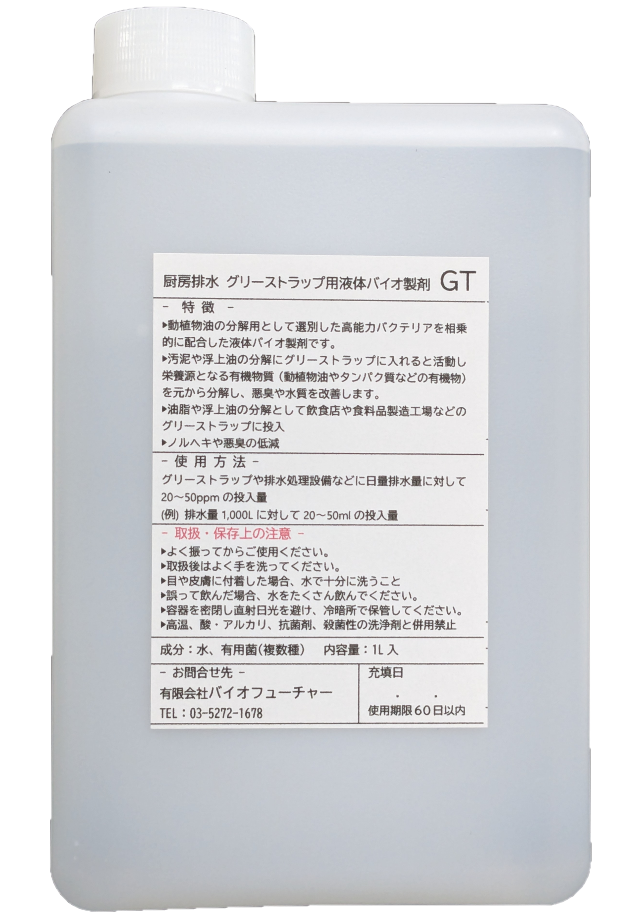 GTは動植物油の分解能力に優れたバクテリアを特別に選別し能力の高い数種類を相乗的に配合した液体バイオ製剤です。