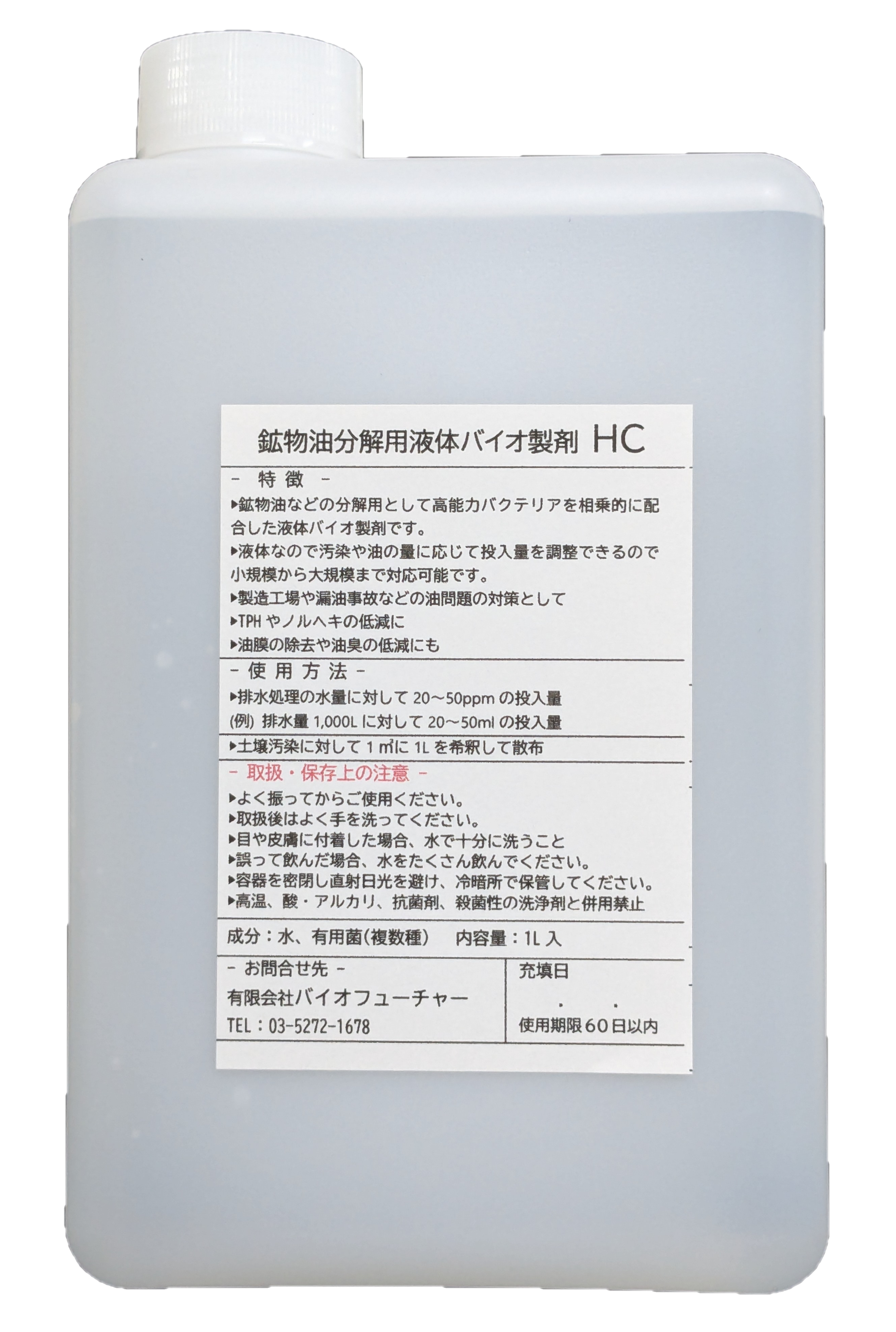 HCは鉱物油などの分解能力に優れるバクテリアを特別に選別し能力の高い数種類を相乗的に配合した液体バイオ製剤です。